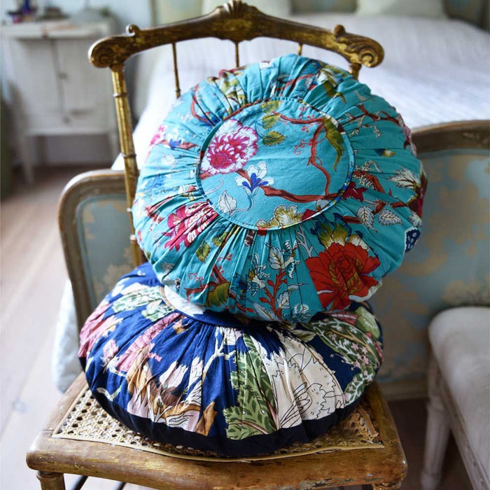 Block Printed Pink & Blue Floral Tile Ruffle Cushion